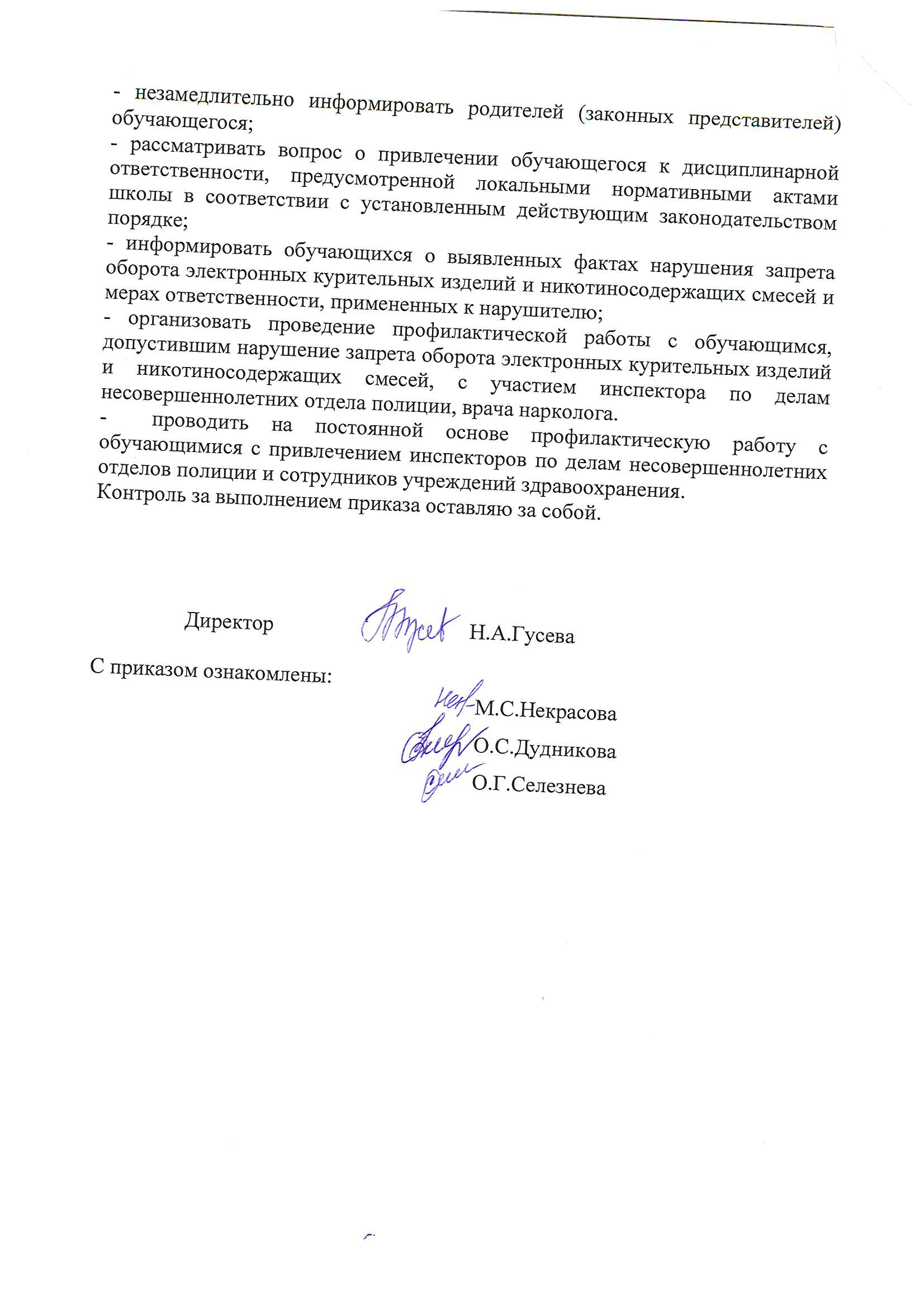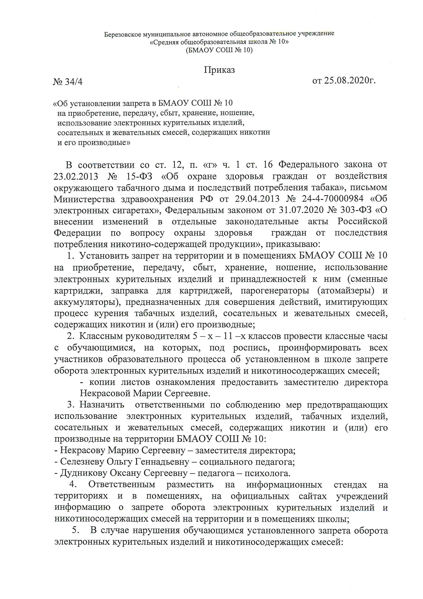 Приказ №34/4 от 25.08.2020 "Об установлении запрета в БМАОУ СОШ № 10 на приобретение, передачу, сбыт, хранение, ношение, использование электронных курительных изделий, сосательных и жевательных смесей, содержащих никотин и его производные"